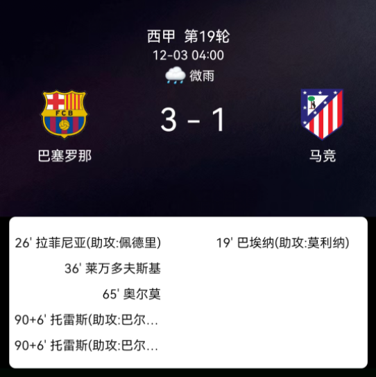 北京时间12月3日4:00,西甲第19轮焦点战,巴塞罗那主场迎战马德里竞技。第19分钟巴埃纳破门,0-1;第26分钟拉菲尼亚破门,1-1;第36分钟莱万失点;第41分钟巴埃纳染黄;第45+2分钟赫拉德-马丁染黄;第65分钟奥尔莫破…