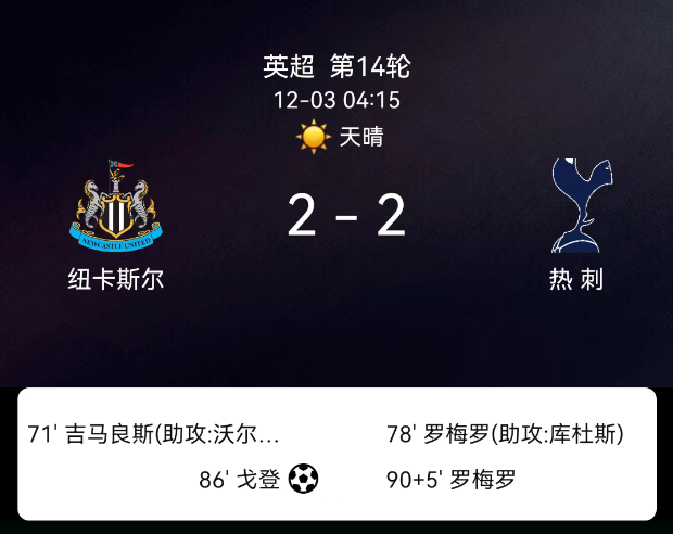 北京时间12月3日,2025-2026赛季英超第14轮,纽卡斯尔联主场对阵托特纳姆热刺。第23分钟热刺首染黄;第56分钟本坦库尔再染黄;第71分钟吉马良斯破门,1-0;第79分钟罗梅罗破门,1-1;第86分钟戈登点射,2-1,里沙利松…