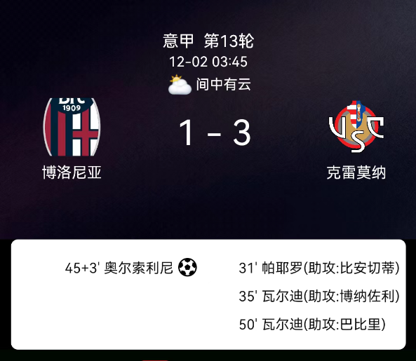 北京时间12月2日,意大利足球甲级联赛第13轮,博洛尼亚主场对阵克雷莫内塞。第31分钟帕耶罗破门,0-1;第35分钟瓦尔迪破门,0-2;第45+3分钟奥尔索利尼点射,1-2;第50分钟瓦尔迪再破门,1-3;克雷莫内塞2黄、博洛尼…
