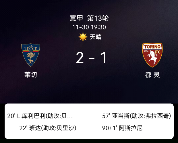 北京时间11月30日,意大利足球甲级联赛第13轮,莱切主场对阵都灵。第20分钟拉萨纳-库利巴利破门,1-0;第22分钟班达破门,2-0;第57分钟切-亚当斯破门,2-1;莱切2张黄牌、都灵3张黄牌;无红牌。最终比分,莱切2-1都…