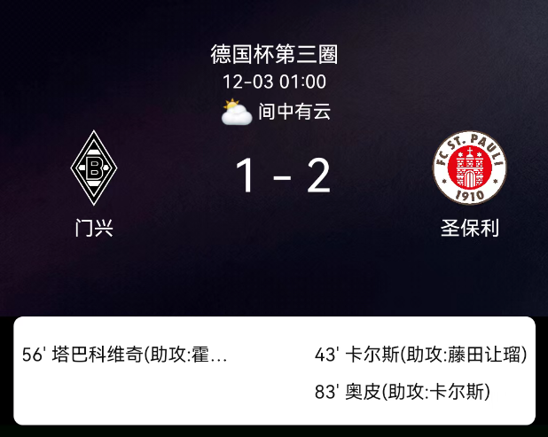 北京时间12月3日,德国足协杯第三轮,门兴格拉德巴赫对阵圣保利。第6分钟圣保利染黄;第43分钟卡尔斯破门,0-1;第56分钟哈里斯-塔巴科维奇破门,1-1;第83分钟奥皮耶破门,1-2;第90+4分钟双方各添1黄;圣保利2黄、…