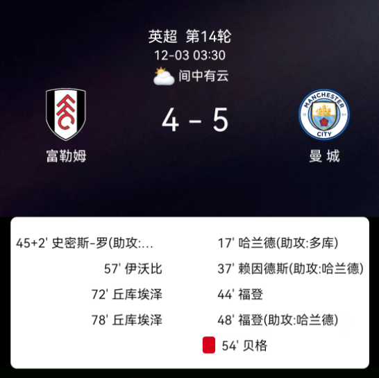 北京时间12月3日,2025-2026赛季英格兰足球超级联赛第14轮,富勒姆主场对阵曼城。第17分钟哈兰德破门,0-1;第37分钟赖因德斯破门,0-2;第45分钟福登破门,0-3;第45+1分钟史密斯-罗破门,1-3;第48分钟福登再破门,…