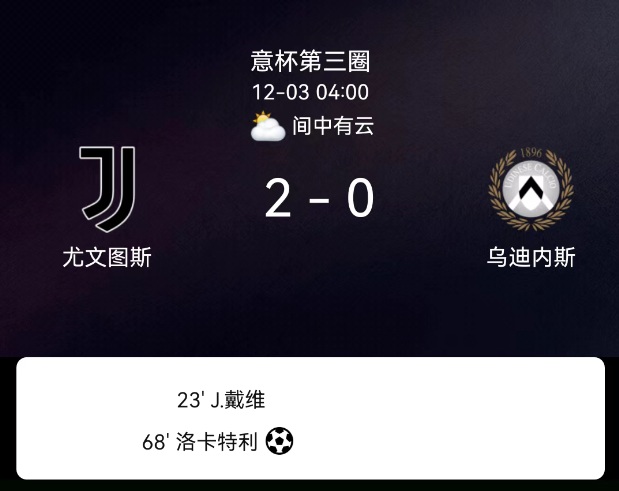 北京时间12月3日,意大利杯1/8决赛,尤文图斯对阵乌迪内斯。第23分钟乔纳森-戴维破门,1-0;第31分钟埃希兹布破门被判越位;第36分钟乔纳森-戴维破门再被吹;第68分钟洛卡特利点射,2-0;第90+5分钟奥蓬达破门无效;…