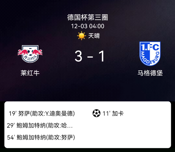 北京时间12月3日,德国足协杯第三轮,rb莱比锡对阵马格德堡。第8分钟马格德堡染黄;第11分钟格纳卡点射,0-1;第19分钟努萨破门,1-1;第20分钟莱比锡染黄;第21分钟马格德堡再染黄;第29分钟鲍姆加特纳破门,2-1;第…