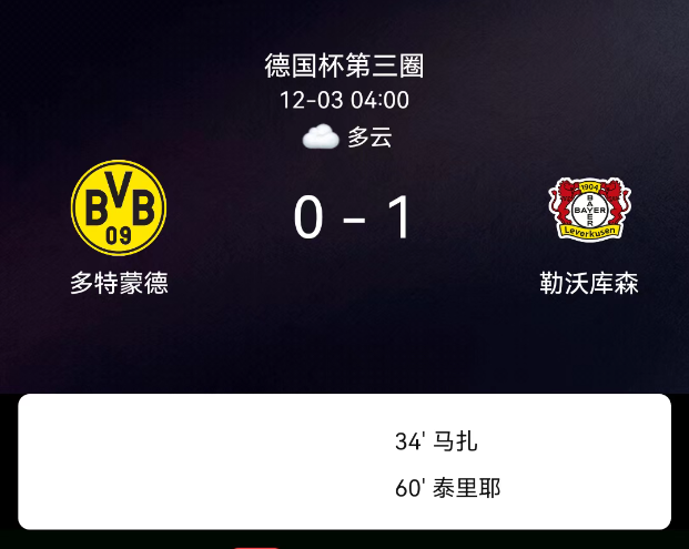 北京时间12月3日,德国足协杯第三轮,多特蒙德对阵勒沃库森。第34分钟马扎破门,0-1;第60分钟泰里耶破门被判越位;第68分钟至90分钟双方累计5黄;多特3黄、勒沃库森2黄;无红牌。最终比分,多特蒙德0-1勒沃库森。关…