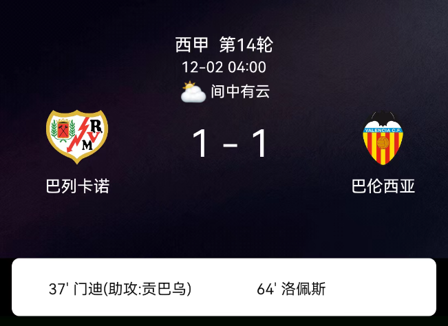 北京时间12月2日,西班牙足球甲级联赛第14轮,巴列卡诺主场对阵瓦伦西亚。第37分钟诺贝尔-门迪破门,1-0;第51分钟巴列卡诺染黄;第64分钟迭戈-洛佩斯破门,1-1;第89分钟瓦伦西亚染黄;双方各1黄;无红牌。最终比分…