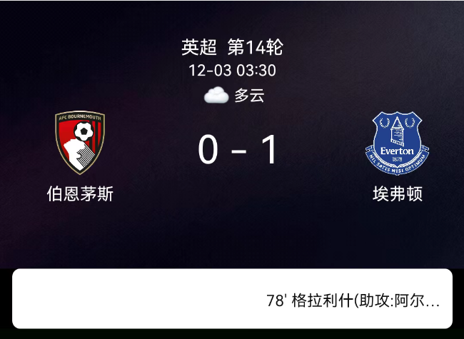 北京时间12月3日,2025-2026赛季英格兰足球超级联赛第14轮,伯恩茅斯主场对阵埃弗顿。第45+2分钟,克鲁皮破门被判越位;第56分钟,亚当斯染黄;第80分钟,格拉利什射门折射入网,0-1。最终比分,伯恩茅斯0-1埃弗顿。…