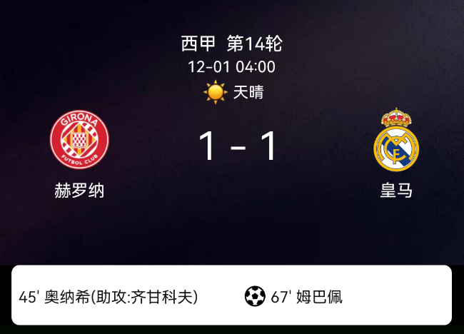 北京时间12月1日,西班牙足球甲级联赛第14轮,赫罗纳主场对阵皇家马德里。第42分钟赫罗纳染黄;第45分钟欧纳希破门,1-0;第59分钟欧纳希染黄;第67分钟姆巴佩点射,1-1;第74分钟瓦纳特染黄;赫罗纳3黄、皇马无牌。…